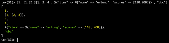 Elixir 에의 모든 집합형의 모든 항목은 모든 데이터 형(집합형을 포함)이 될 수 있습니다.