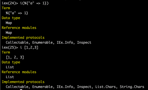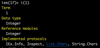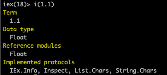 iex 에는 i/1 라는 아주 훌륭한 함수가 있습니다. (함수의 이름이 i이며, 파라미터를 하나 받는 함수라는 의미입니다.) 이 함수는 파라미터로 준 값이 어떤 데이터 형인지를 알려줍니다.
