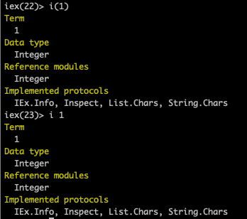 i(1.1) 은 Float 형이라고 알려줍니다. 여기서,, 한가지... Elixir에서는 사실 함수를 호출할 때 파라미터를 감싸는 ()를 생략해도 됩니다. 다만, 함수 이름과 파라미터 사이에 공백 문자는 주어야 합니다.
