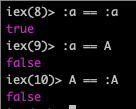 그럼. 애텀 :a 와 애텀 A는 다른 것인가요? 또 애텀 A는 애텀 :A 와도 다른 것인가요..? 확인을 해보지요.. 비교 함수 == 이를 사용해 보겠습니다.