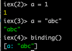 iex에서는 거의 쓸 일이 없지만, 실제 프로그래밍에서는 특정 함수 내에서 binding()을 호출하여, 그 지점에서 각 변수들의 상태 값을 확인하는 용도로 사용합니다.