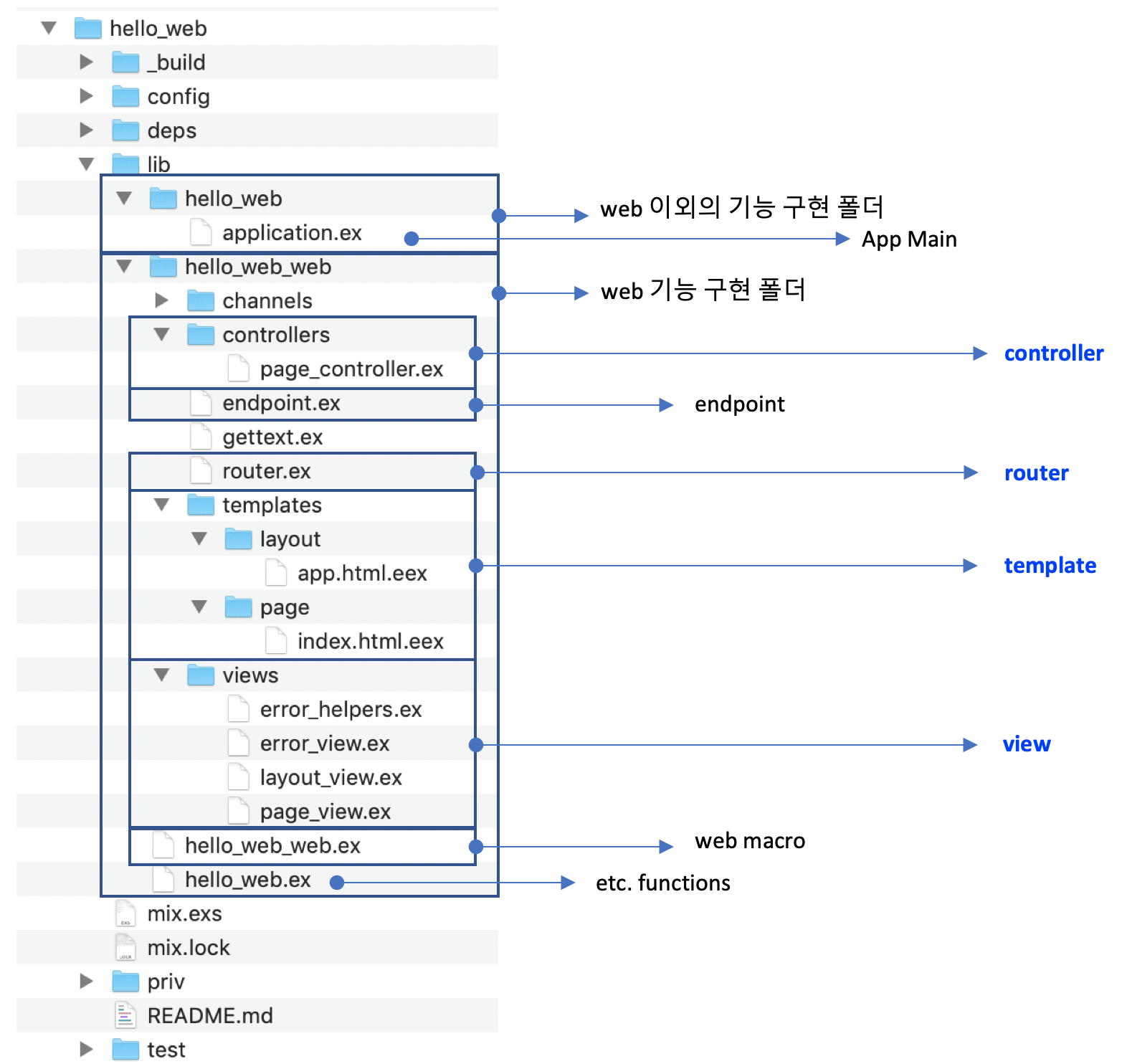 Phoenix Project는 일반 Elixir Project와 같은 구조를 가지고 있습니다. 다음 소스파일이 위치하는 lib 폴더에는 Web 관련된 추가 하위 폴더들이 생성됩니다.