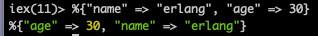 위의 예에서는 이름을 "name"이라는 문자열로 지정한 것이고, 아래의 예는 :name이라는 애텀을 사용한 경우 입니다.( ":" 문자 다음의 숫자나 특수문자가 아닌 문자 - 한글도 가능합니다. - Elixir는 기본적으로 유니코드를 지원하므로 변수명과 애텀에 영문자 이외의 언어문자를 사용하는 것이 가능합니다. 뒤에 설명이 나오겠지만, 우선은 영소 문자로 시작되는 애텀을 만들고 싶을 때는 영소 문자 앞에 ":"를 붙인다고 생각하시면 됩니다. )